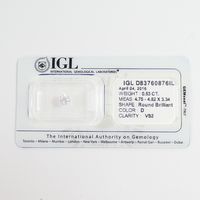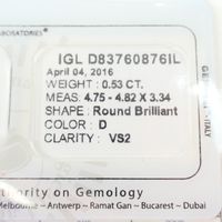Diamant taille brillant sur papier sous scellée. Avec un certificat IGL N° D83760876IL. Indiquant : 0,53 carat. D / VS2. Sans fluorescence.