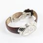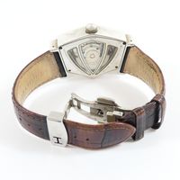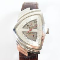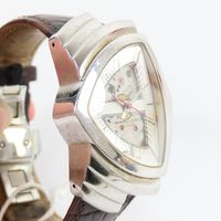 HAMILTON : modèle "Ventura", montre sur bracelet. Boitier triangulaire en acier. Cadran squelette à index appliqués (Certains décollés). Mouvement mécanique à remontage automatique. Fond squelette. Signé et numéroté. Bracelet en cuir à boucle déployanté en acier. Signée. Tour de poignet : 17 cm environ).