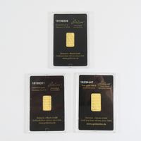 HEIMERLE + MEULE : lot comprenant 3 lingotins de 5 g. d'or 999,9 mil. Sous scellée.