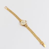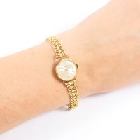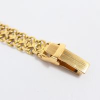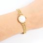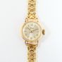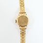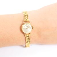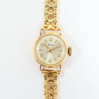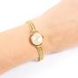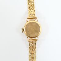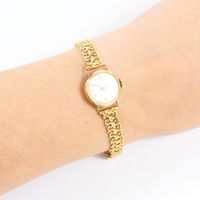 LUXE : bracelet-montre en or 750 mil. Boîtier rond à lunette lisse. Cadran crème à index et chiffres arabes. (Diam. : 26 mm). Mouvement mécanique à remontage manuel. Bracelet à maille articulée. Fermoir échelle à rabbat à sécurité. Travail français. (Longueur : 15 / 16 cm environ) (révision à prévoir). 15,7 g. brut.