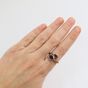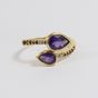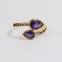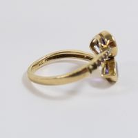 MATY : bague croisée en or 375 mil. Ornée d'améthytse taille poire épaulées de diamants et de petites améthyste. (TDD : 58) (déformée) (Pierres manquantes). 3,4 g. brut.