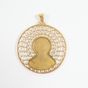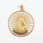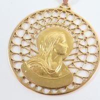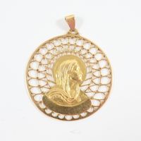 Médaille religieuse : en or 750 mil. À décor ajouré figurant la Sainte Vierge Marie. (Longueur avec bélière : 5 cm environ) (Diam. : 4 cm environ) (Non chiffrée). 9,6 g.