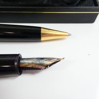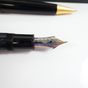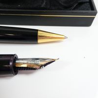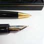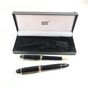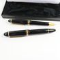 MONTBLANC : modèle Meisterstuck, lot dans un écrin MONTBLANC : comprenant un stylo plume N° 149 en résine et métal doré. Plume en or 750 mil. Exemptée [Art. 524 bis du CGI al. C]. Signé et numéroté. Et un stylo Bille en résine noire et métal doré. Signé et numéroté. Avec un chiffon MONTBLANC.
