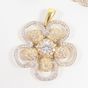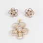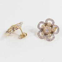 Paire de boucle d'oreilles "Fleur" : deux ors 750 mil. Ornée de pierres imitations blanche. (Diam. : 2,1 cm environ). Et un pendentif deux ors 750 mil. Orné de pierres imitations blanches. (Diam. : 4,4 cm environ). 20,7 g. brut.