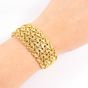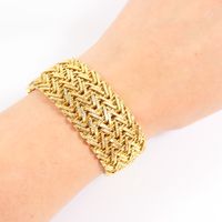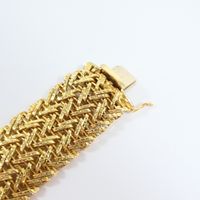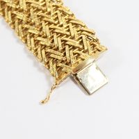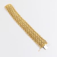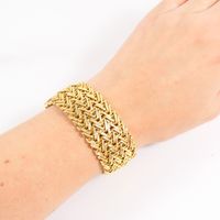 UNOAERRE : bracelet manchette en or 750 mil. Fermoir cliquet à huit de sécurité. Signé. (Longueur : 19,5 cm environ) (Largeur : 2,5 cm environ). 46,8 g. brut.