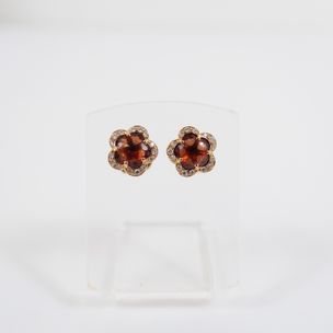 400 / 500 €PASCALE BRUNI "Figlia dei Fiori" : Paire de boutons d'oreilles en or rose 750 mil. centrés d'une rhodolite dans un entourage de diamants taille brillant (diamètre : 0,9 cm). Signés. 2,3 g. brut.