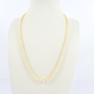 150 / 250 €Collier d'un rang de perles de culture : en chute (diamètre des perles : 3,3 à 7,8 mm environ), avec fermoir en platine 850 mil. serti d'une émeraude et de diamants taille ancienne et 8/8, avec chaînette de sécurité en or gris 750 mil. (longueur : 45,5 cm) (fermoir cassé). 15,2 g. brut.