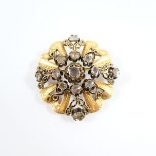 1 200 / 1 500 €Epoque Napoléon III : Broche ronde ajourée en or 750 mil. ciselé et guilloché sertie de roses et à décors émaillés (diamètre : 4,4 cm) (manques, soudures, déformations). 18,7 g. brut.