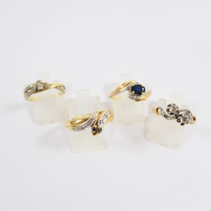 550 / 650 €4 bagues : 2 ors 750 mil. (saphirs, roses, diamants taille brillant et taille 8/8) (TDD : 53,5 ; 57,5 et 59,5) (légères déformations). 9,1 g. brut.