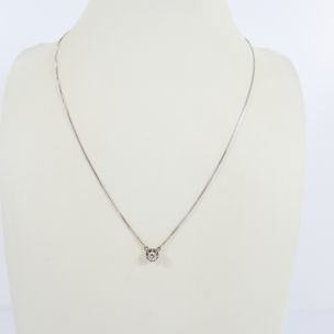 180 / 220 €Collier : en or gris 750 mil. à maillons gourmette retenant un diamant taille brillant de 0,18 ct environ, avec chaînette de sécurité en argent 800 mil. cassée (cassée, manque). 2,5 g. brut.