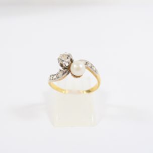 200 / 300 €Bague "toi & moi" : en or 750 mil. et platine 850 mil. sertie d'une perle de culture (diamètre : 5 mm environ), d'un diamant taille ancienne de 0,35 ct environ et de roses (TDD : 56) (usures, trace de mise à grandeur, trace de colle). 3 g. brut.