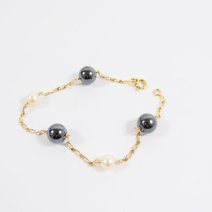 200 / 250 €Bracelet : en or 750 mil. à maillons cheval alternés de boules d'hématite et de perles de culture (diamètres : 8,1 et 5,9 mm) (longueur : 18,5 cm environ). 6 g. brut.