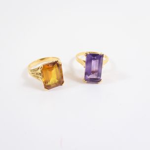 500 / 600 €2 bagues : en or 750 mil. (améthyste cassée et pierre imitation orange) (TDD : 55 et 53). 10,7 g. brut.