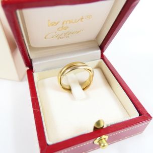 300 / 400 €Must de CARTIER "Trinity" : Anneau triple 3 ors 750 mil., signé (TDD : 52). 4,9 g. Avec son écrin et sa boîte.