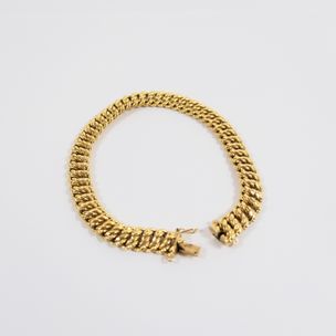 900 / 1 000 €Bracelet : en or 750 mil. à maillons gourmette US (longueur : 19,3 cm ; largeur : 0,8 cm) (manque la chaînette de sécurité). 14,4 g.