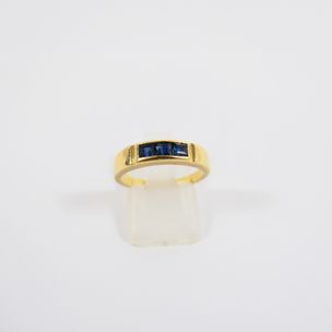 200 / 250 €Bague : en or 750 mil. sertie de 3 saphirs calibrés (TDD : 50). 3,3 g. brut.