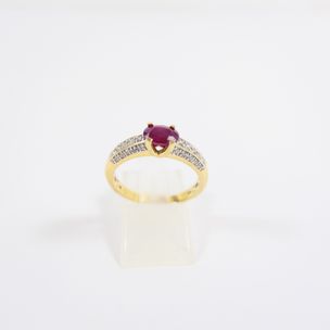 300 / 400 €Bague : 2 ors 750 mil. centrée d'un rubis chauffé épaulé de lignes de diamants taille brillant (TDD : 57,5). 4,1 g. brut.