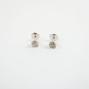 300 / 400 €Paire de clous d'oreilles : en or gris 750 mil. sertis chacun d'un diamant taille brillant de 0,35 ct environ, avec systèmes Alpa (salissures). 1,6 g. brut.
