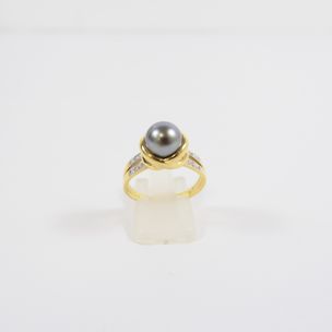 300 / 350 €Bague : 2 ors 750 mil. centrée d'une perle de culture grise (diamètre : 8,3 mm), épaulée de petits diamants taille brillant (TDD : 57,5). 5,4 g. brut.