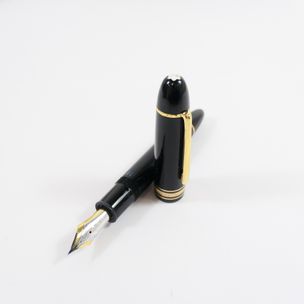 100 / 150 €MONTBLANC "Meisterstück" n°149 : Stylo-plume en résine noire et métal doré, plume 2 ors 750 mil., système de remplissage à pompe, signé (usures, rayures, salissures). 30,7 g. brut [Exempté : art. 524 bis du CGI al. c].