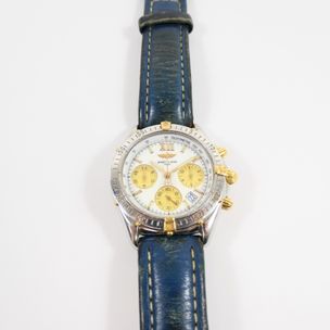 500 / 600 €BREITLING "Windrider" : Montre-bracelet chronographe en acier, boîtier rond (diamètre : 36 mm), lunette tournante graduée avec cavaliers en or 750 mil., vis en métal doré, cadran blanc à 3 compteurs dorés, chiffres romains dorés, guichet dateur à 16H, aiguilles et index luminescents, mouvement à quartz, sur bracelet en cuir bleu usé à boucle ardillon en acier siglée (manque 1 cavalier, rayures, chocs). 62,4 g. brut. [Exempté : art. 524 bis du CGI al. c].