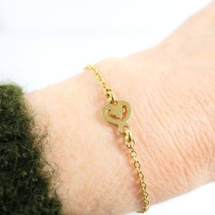 180 / 240 €OJ PERRIN : Bracelet en or 750 mil. à maillons forçat rond, retenant un cœur ajouré. Signé. (Longueur réglable : 18,3 et 16,4 cm environ) (fermoir usé). 3,1 g.
