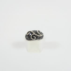 350 / 450 €Bague jonc : en or gris 750 mil. ornée d'un pavage de diamants noirs taille brillant et de diamants blancs taille 8/8 (TDD : 54 ; largeur : 1,1 cm). 6 g. brut.