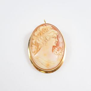 200 / 250 €Broche ovale pouvant former pendentif : en or 750 mil. ornée d'un camée coquille figurant un profil un profil féminin (dimensions : 4,4 x 3,4 cm) (épingle déformée). 8,2 g. brut.