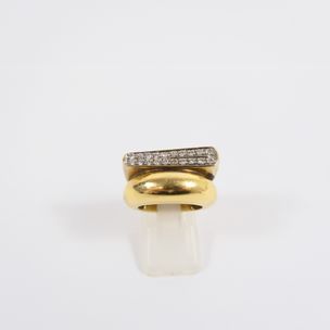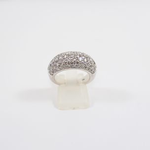 900 / 1 100 €Bague : 2 ors 750 mil. ornée d'un pavage de diamants taille brillant (TDD : 50, avec boules de mise à grandeur interne) (rhodiage à prévoir). 14,5 g. brut.