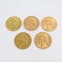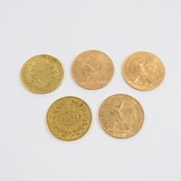 5 pièces de 20 FRF en or 900 mil. (datées : An 12, 1848, 1906, 1907 et 1914) (chocs et usures sur 2 d'entre elles). 32,2 g.