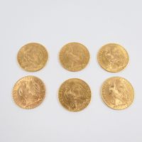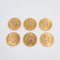 6 pièces de 20 FRF : en or 900 mil. (datées : 1907, 1908, 1910, 1912 et 1913). 38,7 g.