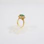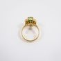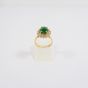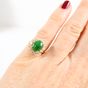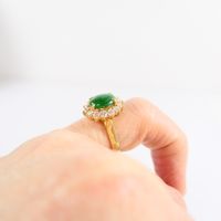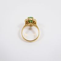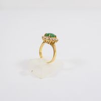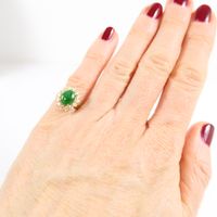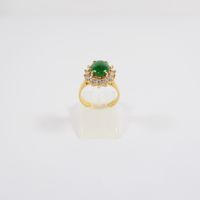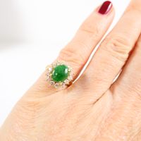 Bague fleur : en or 750 mil. centrée d'un cabochon de jade dans un entourage de diamants taille brillant (TDD : 47 ; dimensions du chaton : 1,3 x 1,3 cm). 4,3 g. brut.