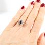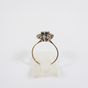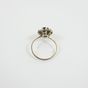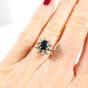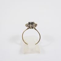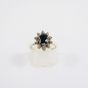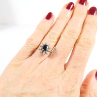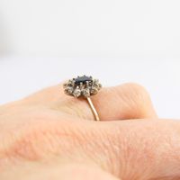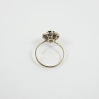 Bague fleur : en or gris 750 mil. centrée d'un saphir ovale dans un entourage de diamants taille 8/8 (TDD : 51 ; diamètre du chaton : 1,4 x 1,1 cm). 2,5 g. brut.