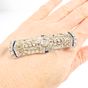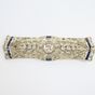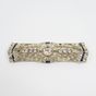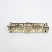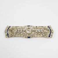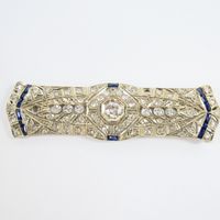 Broche plaque : en or gris 585 mil. centrée d'un diamant taille ancienne de 0,45 ct environ, dans un entourage de petits diamants taille ancienne et 8/8, de roses, et de pierres imitation bleues calibrées (dimensions : 6,6 x 1,8 cm) (pierres manquantes, pierre cassée). 10,2 g.