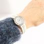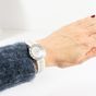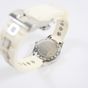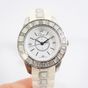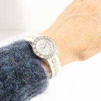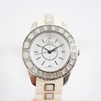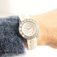 DIOR Christal : Bracelet-montre de dame en acier, boîtier rond (diamètre : 28 mm), lunette tournante sertie de diamants brillantés et de céramique blanche, cadran blanc à index bâtons, mouvement à quartz, sur bracelet en caoutchouc et céramique blanche à boucle déployante papillon signée.