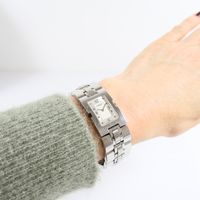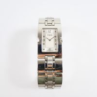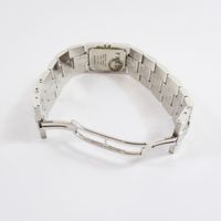 FRED "Ligne 36" : Bracelet-montre de dame en acier, boîtier rectangulaire (dimensions : 20 x 30 mm), cadran blanc et gris à index carrés et chiffres arabes argentés appliqués, guichet dateur à 6H, mouvement à quartz, sur bracelet articulé en acier à boucle déployante papillon signée (longueur : 16 cm environ).