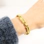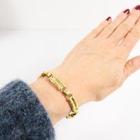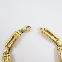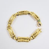 KORLOFF : Bracelet en or 750 mil. à maillons guilloché "impression cuir". Porte le monogramme émaillé vert. (Longueur : 18,2 cm ; largeur : 0,8 cm) (émail accidenté). 34,2 g. brut.