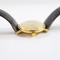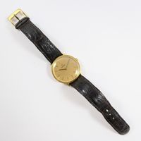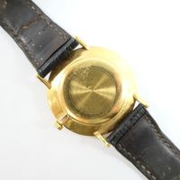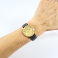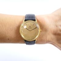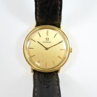 OMEGA : Montre-bracelet en or 750 mil., boîtier rond (diamètre : 33 mm), cadran doré à index bâtons dorés appliqués, mouvement mécanique, sur bracelet en cuir marron usagé à boucle ardillon métal (verre rayé, petits chocs sur la lunette). 29,8 g. brut.