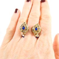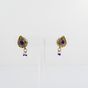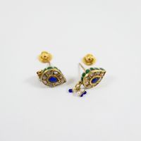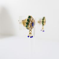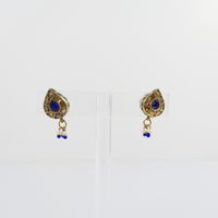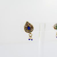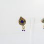Paire de boutons d'oreilles : en or 375 mil. piriformes à décor émaillé, sertis de roses, et de pierres imitation, retenant une pampille sertie de perles de culture et de verre bleu. Travail indien. (Dimensions : 2,5 x 1,1 cm) (émail accidenté). 8,7 g. brut.