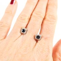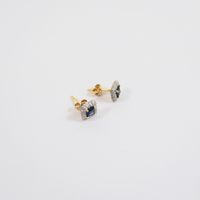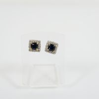 Paire de boutons d'oreilles carrés : 2 ors 750 mil. centrés d'un saphir dans un entourage de petits diamants taille brillant) (dimensions : 0,7 cm). 1,7 g. brut.