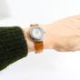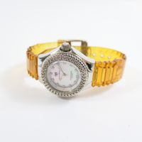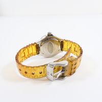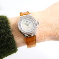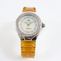 TECHNOMARINE : Montre-bracelet de dame en acier, boîtier rond (diamètre : 30 mm), lunette sertie de diamants taille brillant, cadran en nacre, à index diamantés, mouvement à quartz, sur bracelet en caoutchouc orange à boucle ardillon en acier siglée (salissures).