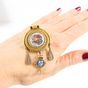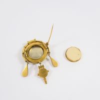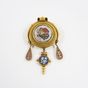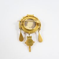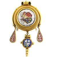 Travail néo-étrusque de la seconde moitié du XIXème : Broche pouvant former pendentif en or amati 750 mil. formant porte-photo (au dos) à décor de cordelette retenant 3 pampilles, ornée de micro mosaïque représentant un papillon, et des décors floraux (dimensions : 6 x 3,5 cm environ) (petits manques). 21,9 g. brut.