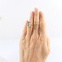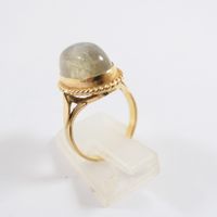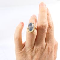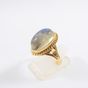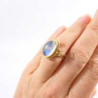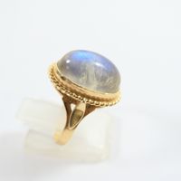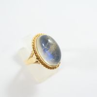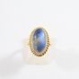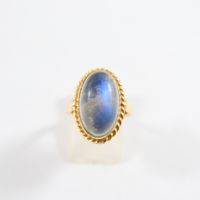 Bague : en or jaune 750 mil., sertie d'un cabochon de pierre de lune bleue dans un entourage torsadé. (TDD : 51). Poids brut : 5,5g (Fissures et égrisures).