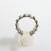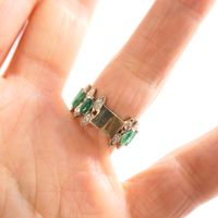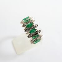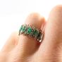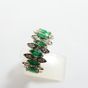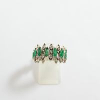Bague bandeau : en or gris 750 mil., sertie de petites émeraudes taille navette ( égrisures et chocs) alternée de petits diamants taille brillant. (TDD : 55) (Mise à taille visible). Poids brut : 6,2g
