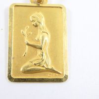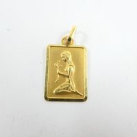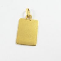 Médaille rectangulaire : en or jaune 750 mil., à décor gravé d'une jeune fille priant. Signée CP. (2,3 x 1,3cm environ). Poids : 1,4g.