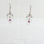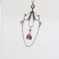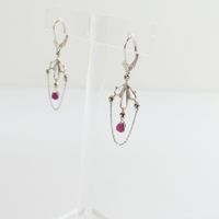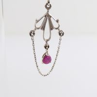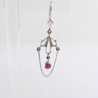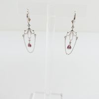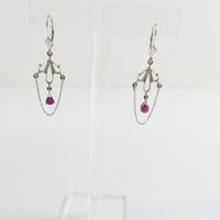 Paire de pendant d'oreille : en or gris 750 mil., à volute ajourée retenant un petit rubis piriforme en pampille. (Longueur : 3,3cm environ). Poids brut : 3,5g