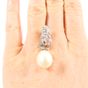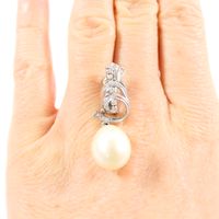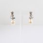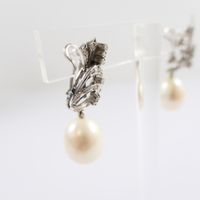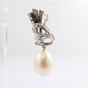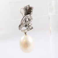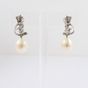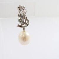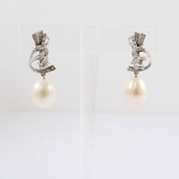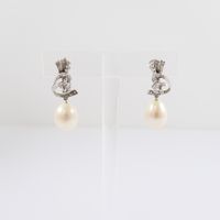 Paire de pendants d'oreille : en or gris 585 mil. à décor de volutes stylisées serties de diamants taille brillant (0,02 carats environ) retenant une perle de culture piriforme. (Longueur : 3,5cm). Poids brut :11,8g
