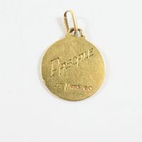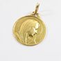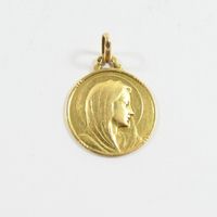 Pendentif médaillon : en or jaune 750 mil., circulaire au profil de la Vierge Marie. Le verso gravé du prénom Pascale et daté 27 mars 1960. (Diamètre : 1,8cm). Poids : 3g