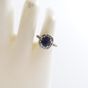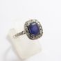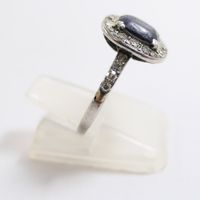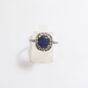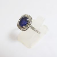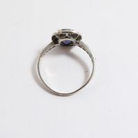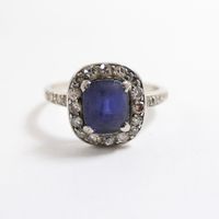 Bague en platine 850 mil centrée d'une pierre de couleur très égrisée entourée et épaulée de diamants 8/8 (sur épaulement, 1 pierre manquante dont le serti a été comblée par de l'or ) (TDD : 51, anneau déformé). 3,1 g brut.