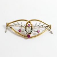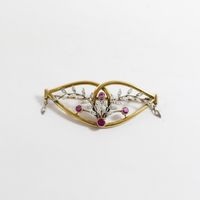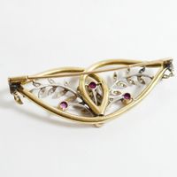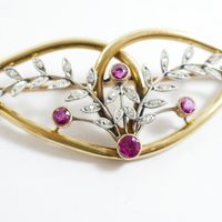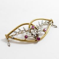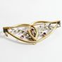 E) Art L833-2 du CGI : Broche ajourée en or 750 mil et platine 850 mil à décor floral composé de diamants TA et de pierres de couleur (Dim : 6 x 2,5 cm environ). 11,4 g brut.